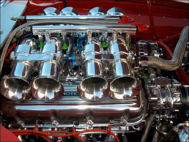 Der Motor ist ein Alu-V8 mit 540 ci (8849 ccm) mit Merlin/Motion Köpfen. Die Kurbelwelle ist eine Eagle Specialties 4340 aus Stahl. Die Kolben sind geschmiedete Mahle 10:1. Die Leistung wird mit 700 HP angegeben. Die 3 Zoll Auspuffanlage mit Hedman headers von Stainless Specialties ist eine Einzelanfertigung |
